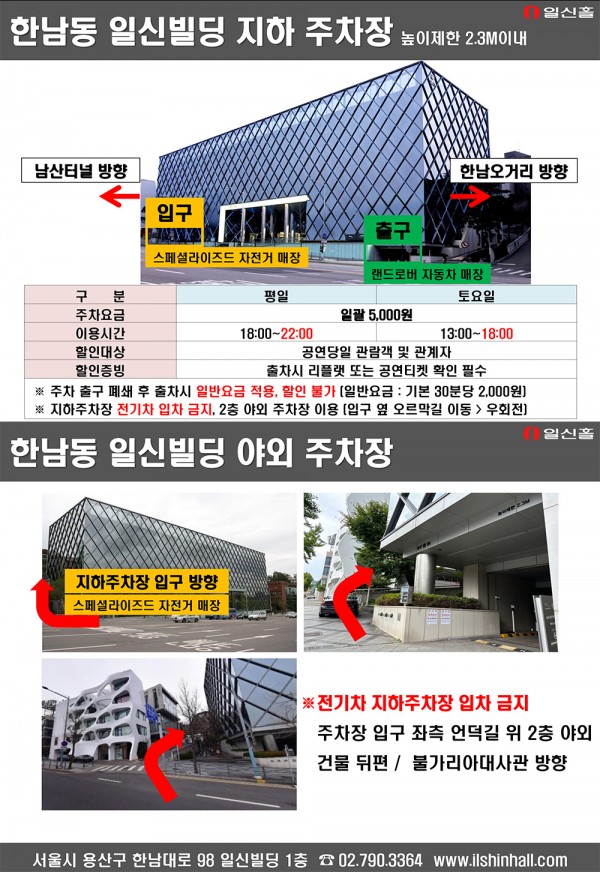 주차장 이용 및 금액은 어떻게 되나요? 페이지 정보 작성자 일신홀 작성일18-05-31 11:30 조회29,126회 댓글0건 관련링크 이전글 다음글 목록 본문 주소 : 서울시 용산구 한남대로 98(한남동 714) 일신빌딩 1층 Tel : 02-790-3364 이전글 다음글 목록